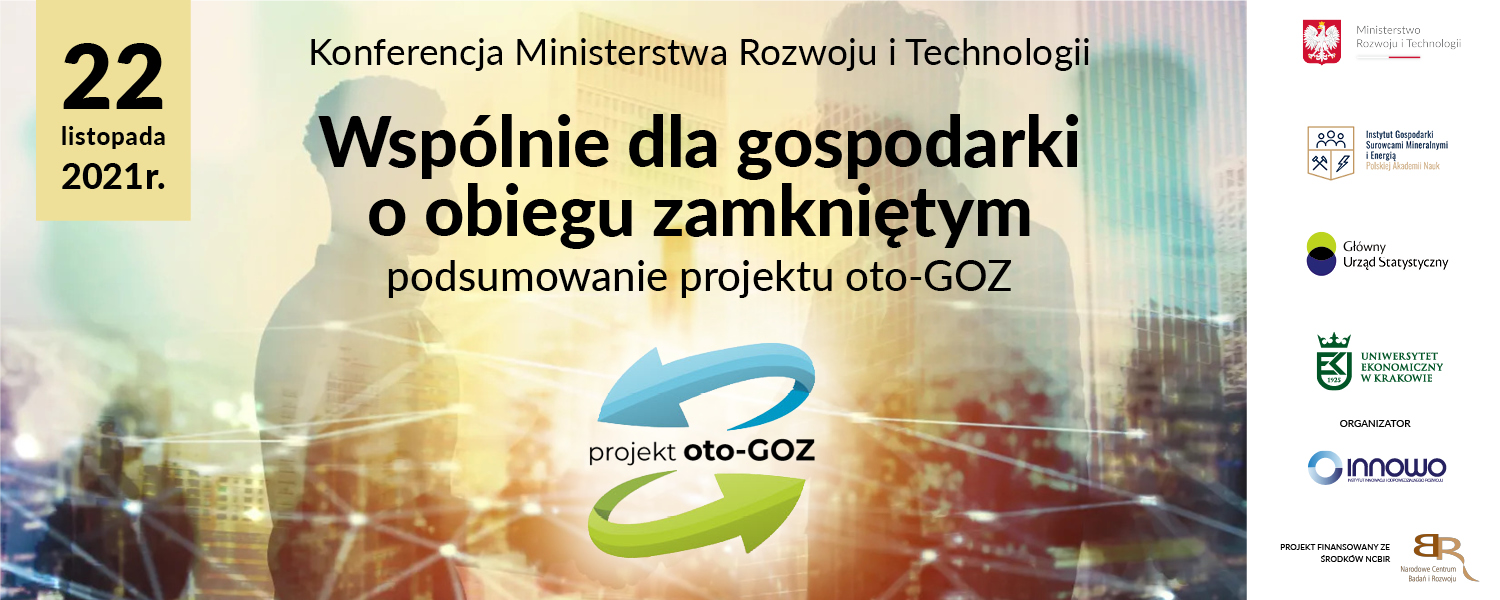 " Jest to wydarzenie wieńczące trzyletni rządowy projekt OTO-GOZ realizowany w ramach projektu GOSPOSTRATEG. Celem projektu było opracowanie systemu wskaźników pomiarowych, umożliwiających ocenę postępu w transformacji w kierunku gospodarki o obiegu zamkniętym oraz wpływu gospodarki cyrkularnej na rozwój społeczno-gospodarczy na poziomie mezoekonomicznym (regionów) i makroekonomicznym (gospodarki narodowej). Projekt realizowany jest przez Konsorcjum, którego Liderem jest Ministerstwo Rozwoju i Technologii, a pozostali partnerzy to Instytut Gospodarki Surowcami Mineralnymi i Energią PAN, Główny Urząd Statystyczny oraz Uniwersytet Ekonomiczny w Krakowie".