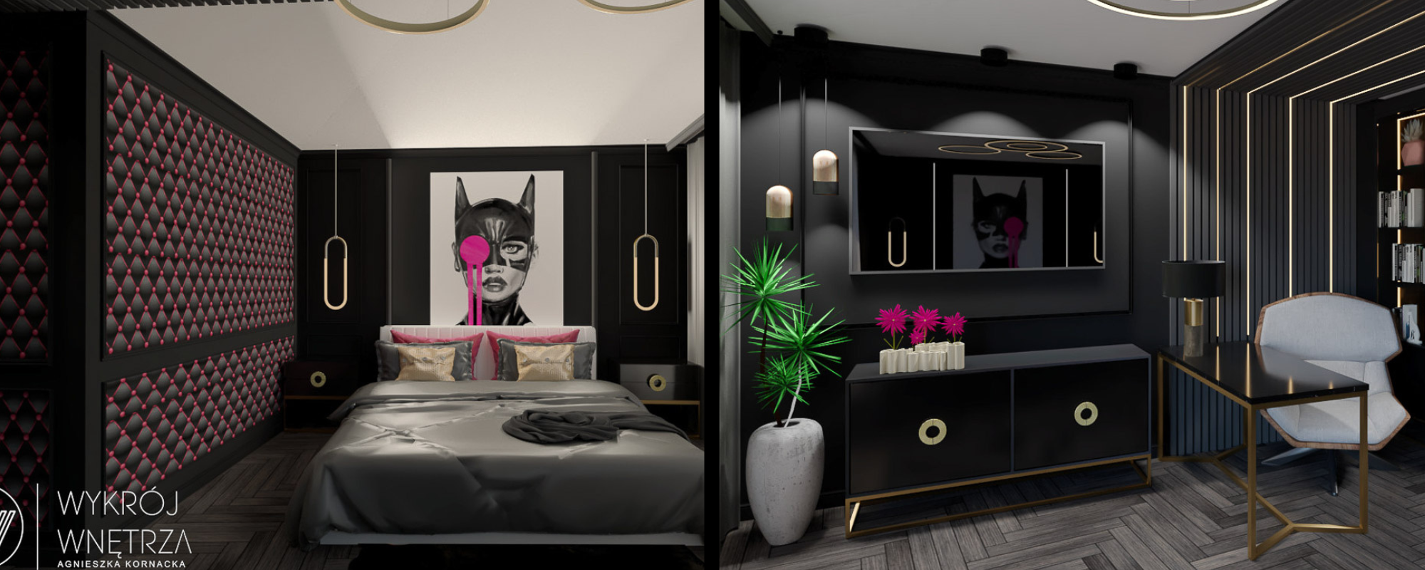 Viva Magenta ma już swój udział w jednym z moich projektów, jednak nie w salonie, a w sypialni w zestawieniu z czernią i złotem. To propozycja dla osób, lubiących glamour i bardziej intensywne barwy. Połączyć w tym stylu kolor roku można z czernią, złotem, białym i czarnym marmurem, a także zielenią butelkową.