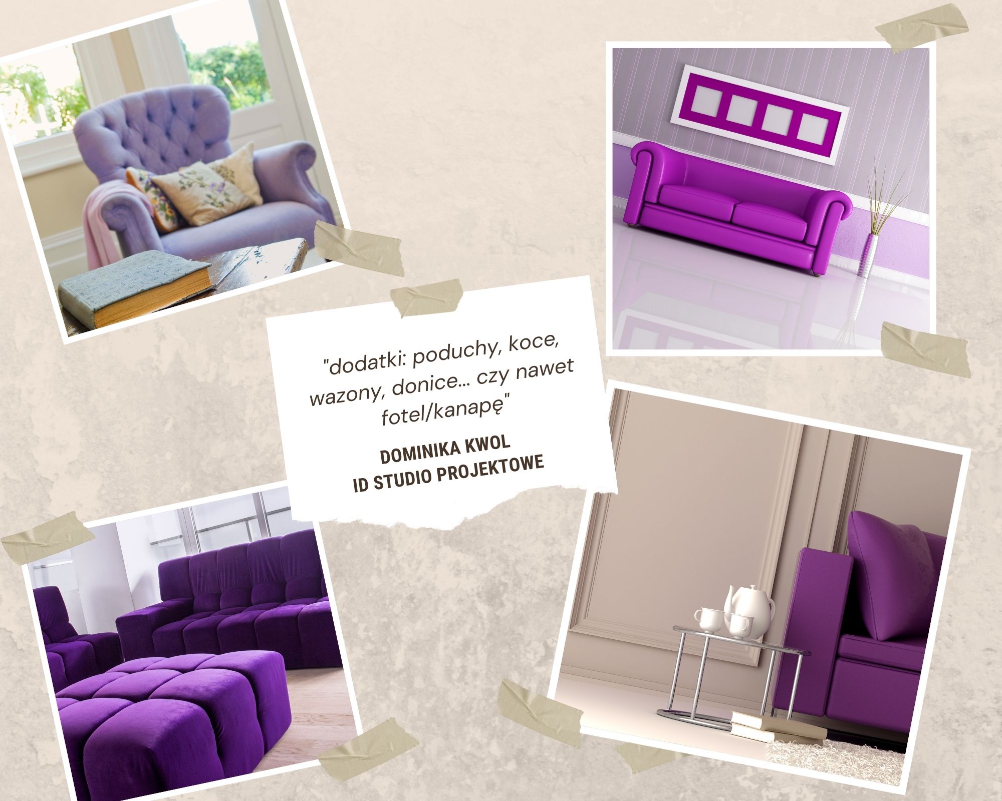 Dominika Kwol ID Studio Projektowe Fiolet to kolor odważny. Jeśli decydujemy się na elementy wystroju w tej barwie warto zadać sobie pytanie, czy szybko się nudzimy nowościami? Jeśli tak, to sugerowałabym postawienie na dodatki: poduchy, koce, wazony, donice... czy nawet fotel/kanapę, którą później możemy odsprzedać. Jednolity fiolet na ścianie z kolei jest dla odważnych, ale może być nużący. By tego uniknąć możemy zastosować tapetę z fioletowym motywem, wykonać ścianę o specjalnej, przecieranej strukturze lub wprowadzić sztukaterię, która doda ścianie światłocienia.