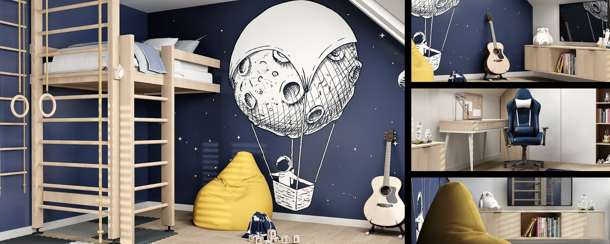 Pierwszy projekt, przedstawia pokój dla 7 letniego Stasia. Chłopiec interesuje się kosmosem, stąd stał się on motywem przewodnim. W pokoju przeważają kolory granatowy i śmietankowy. Staś marzył zawsze o łóżku piętrowym oraz kąciku sportowym. Dopełnieniem pokoju są biurko, wygodny fotel i miejsce na książki.