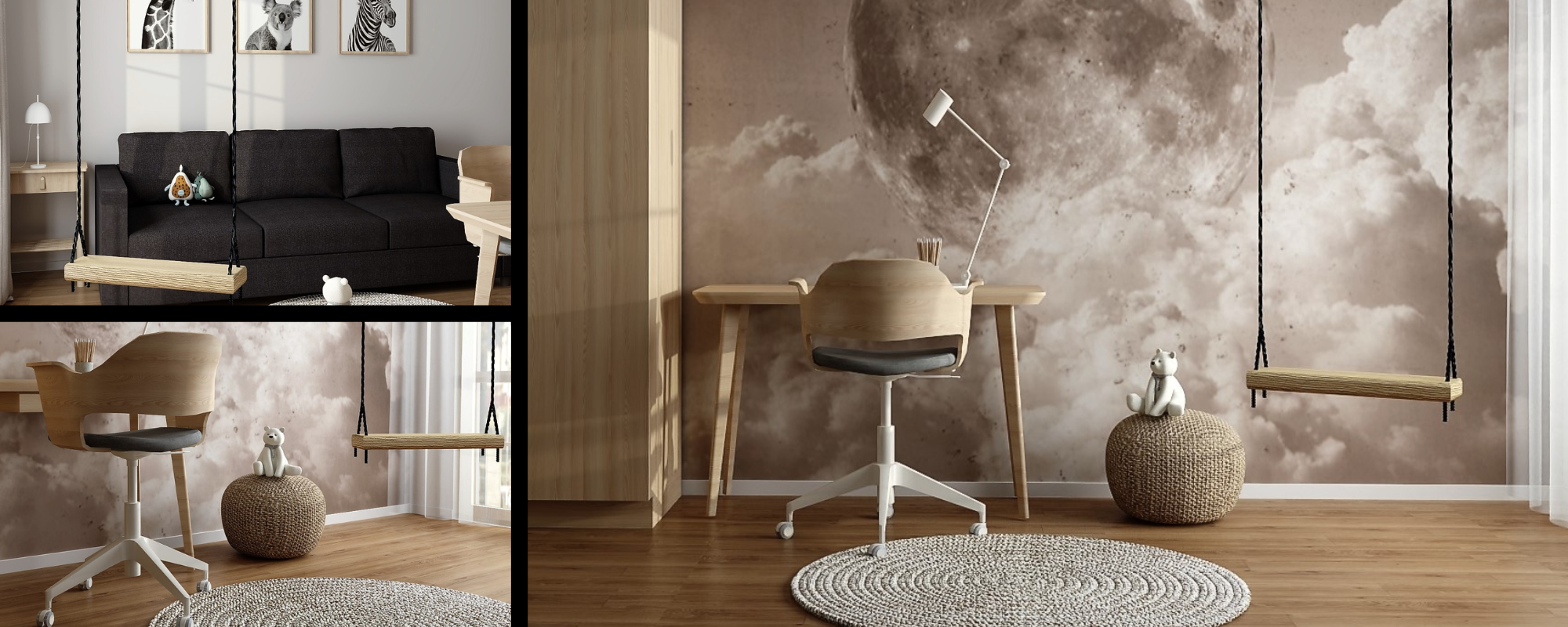 Drugi projekt, to pokój 6 letniej Ani. Wyróżnia się on całkowicie neutralną kolorystyką. Dominują w nim szarości i drewno. Projekt jest neutralny, jeśli chodzi o płeć czy zainteresowania tak, aby przez co najmniej 6-8 lat „rósł” wraz z Anią. Pokój dopełnia drewniana huśtawka i funkcjonalna sofa.