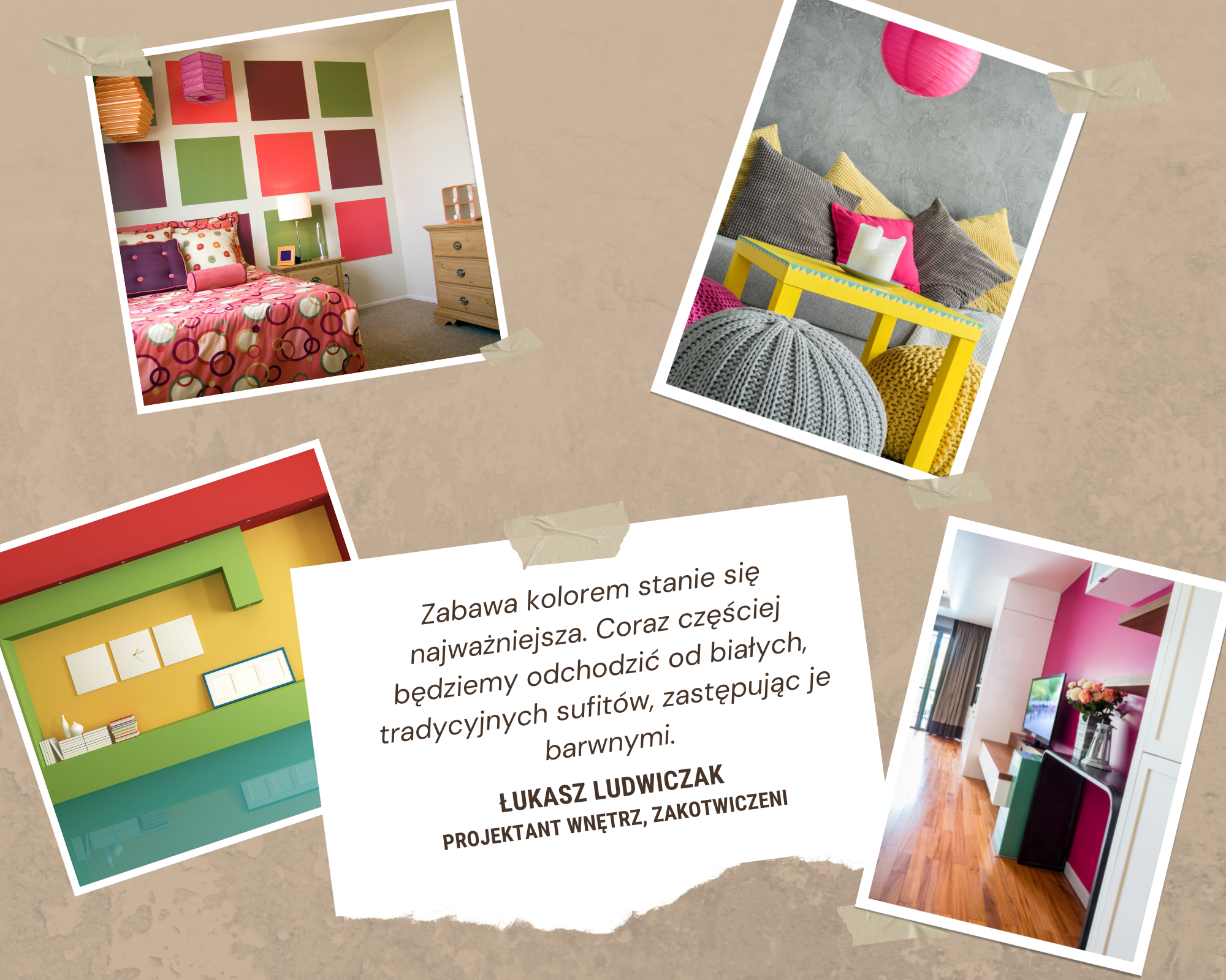 Zabawa kolorem stanie się najważniejsza. Coraz częściej będziemy odchodzić od białych, tradycyjnych sufitów, zastępując je barwnymi (mam przynajmniej taką nadzieję).