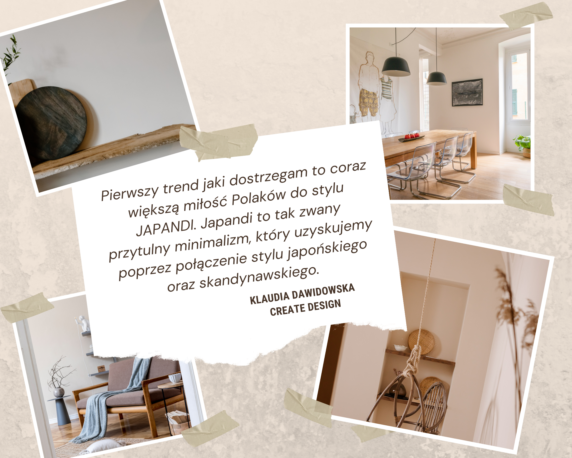 W roku 2022 będą królować dwa typy wnętrz: monochromatyczne - stonowane oraz kolorowe (ale są to kolory zgaszone i nieoczywiste). Pierwszy trend jaki dostrzegam to coraz większą miłość Polaków do stylu JAPANDI. Japandi to tak zwany przytulny minimalizm, który uzyskujemy poprzez połączenie stylu japońskiego oraz skandynawskiego. W tych pomieszczeniach dominuje spokój, harmonia, biele, beże i drewno. W takich wnętrzach bardzo dobrze będzie się nam odpoczywać. Myślę, że potrzeba na Japandi wynika z faktu, że jesteśmy przebodźcowani natłokiem informacji oraz codziennymi problemami. Potrzebujemy wyciszenia i oazy spokoju. Japandi na pewno jest stylem który może nam to dać.